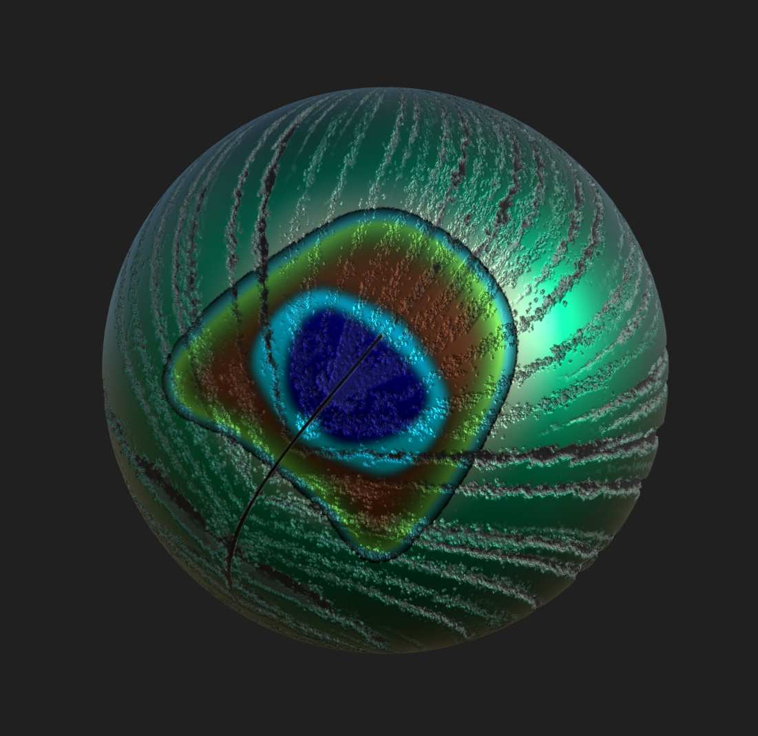 First, I examined my reference to figure out the different layers, which for the peacock feather there were 4 main details that I needed to have: the feathers, the eye design, the feather center, and the greasy shine. One major note is that I made one half first and then mirrored. I started with feathers and experimented with 4 different methods, eventually ending on using the starburst node and then piecing together the different segments for the top, middle, and bottom to get a fanning effect. I then moved on to make the eye design, using various circles that I manipulated and then layered. I then constructed the shape for the center after putting the 2 halves together and blended everything together. I added a metallic mask to get the shine and then in the material tab in the renderer I intensified my height map to help make the feathers have more depth and look fluffier